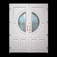 Białe drzwi drewniane na wymiar. Drzwi z litego drewna z okrągłą płaskorzeźbą / dekorem w centralnej części skrzydła i z dwoma bocznymi przeszklonymi dostawkami / z doświetlami.