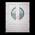 Białe drzwi drewniane na wymiar. Drzwi z litego drewna z okrągłą płaskorzeźbą / dekorem w centralnej części skrzydła i z dwoma bocznymi przeszklonymi dostawkami / z doświetlami.